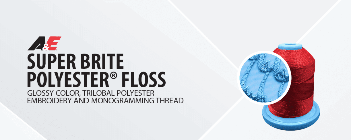Known for its beautiful, rich colors and brilliant sheen, A&E’s Super Brite Polyester® is an industry staple, embroidery thread. Quality industrial embroiderers rely every day on this high tenacity, trilobal polyester embroidery thread as high-quality alternative to traditional, rayon embroidery threads.