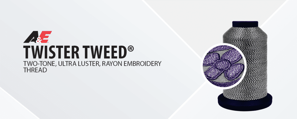 Created with two different, twisted colored yarns, Twister Tweed® is a unique, dual tone variation of A&E’s iconic Super Strength Rayon® embroidery thread. Twister Tweed® provides the same beautiful color, smooth feel, tenacity, and lustrous sheen as Super Strength Rayon®, with a two-tone appearance.