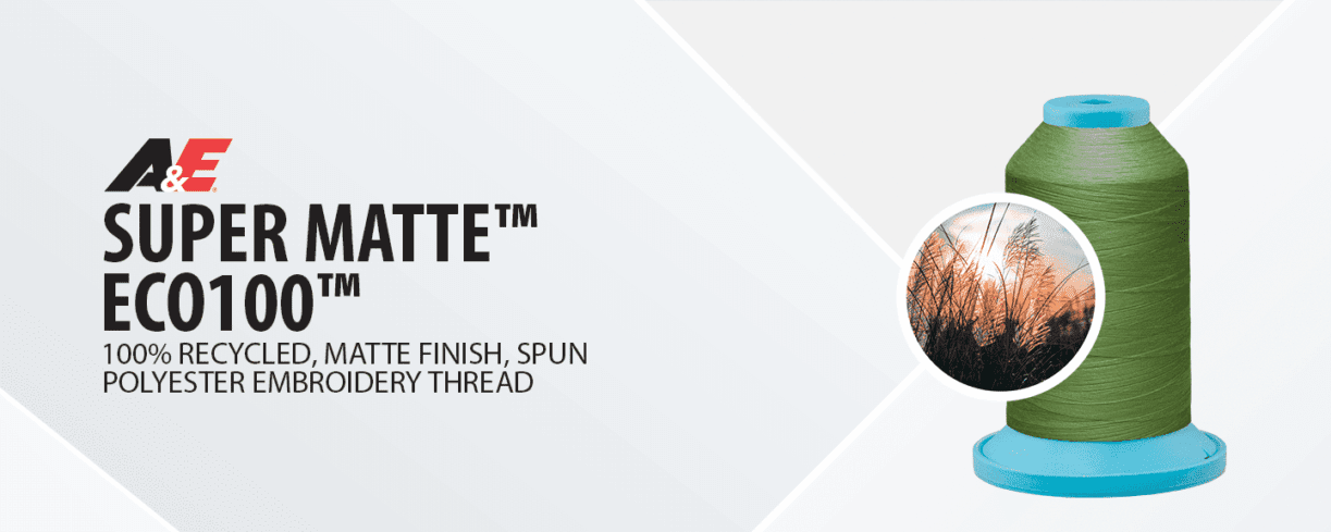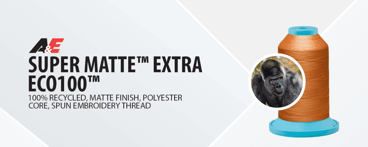 Manufactured in GRS SCOPE CERTIFIED facilities, Super Matte™ Extra ECO100™ is a 100% recycled polyester core embroidery thread. As with A&E’s Super Matte™ Extra, this high-performance embroidery thread is engineered with additional core strength, ensuring excellent stitch formation and appearance, while providing the added eco-friendly benefit of a 100% recycled polyester construction. Available in the same shades as A&E’s iconic Super Brite Polyester® embroidery thread line, Super Matte™ Extra ECO100™ provides muted colors that contrast beautifully against high luster thread products.