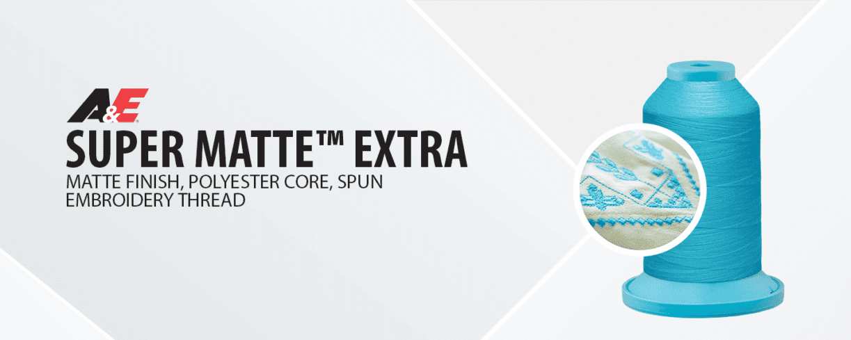 A&E’s Super Matte™ Extra is a polyester core embroidery thread with a matte finish. Engineered to provide additional strength versus spun embroidery threads, Super Matte™ Extra is designed for optimal performance. This high-quality embroidery thread reduces sewing complications, ensuring excellent stitch formation and appearance, while still delivering stunning, muted colors that stand out beautifully against high-luster threads.