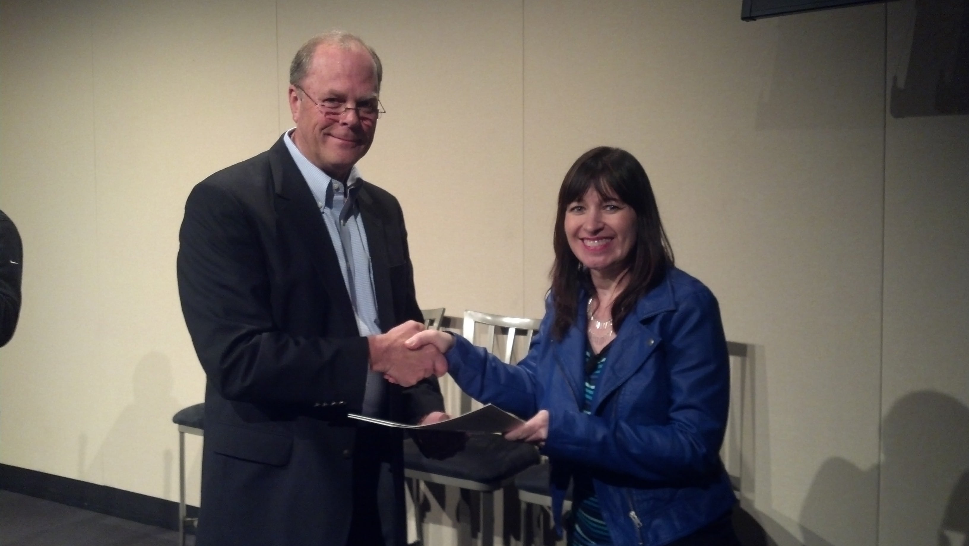 Les Miller, Chief Operating Officer of American & Efird, accepts Nike MSI award from Catherine Newman, Nike Material Sustainability Index Operations Manager, on March 21, 2013.